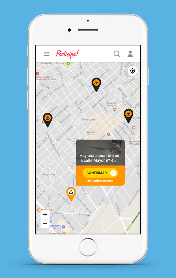 Participa! es una aplicación móvil colaborativa, diseñada y creada para ofrecer a la administración un canal de comunicación sencillo y directo con todos los miembros de su comunidad.